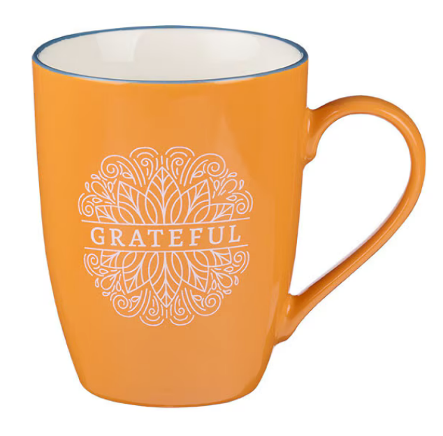 Mug features a pumpkin orange exterior, blue rim, and white glazed interior. An elaborate white outlined leaf design sandwiches the sentiment that is presented in white block letters.